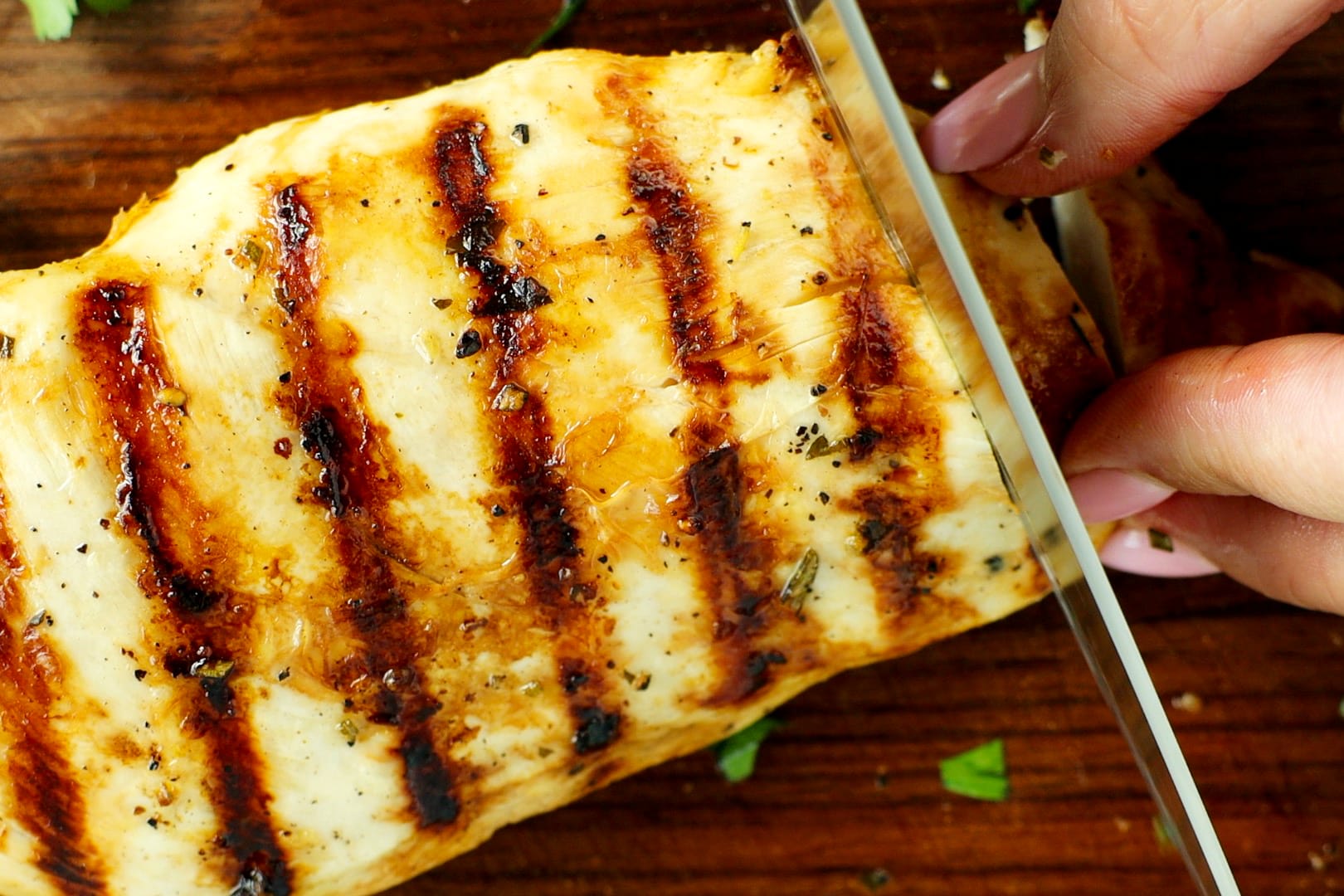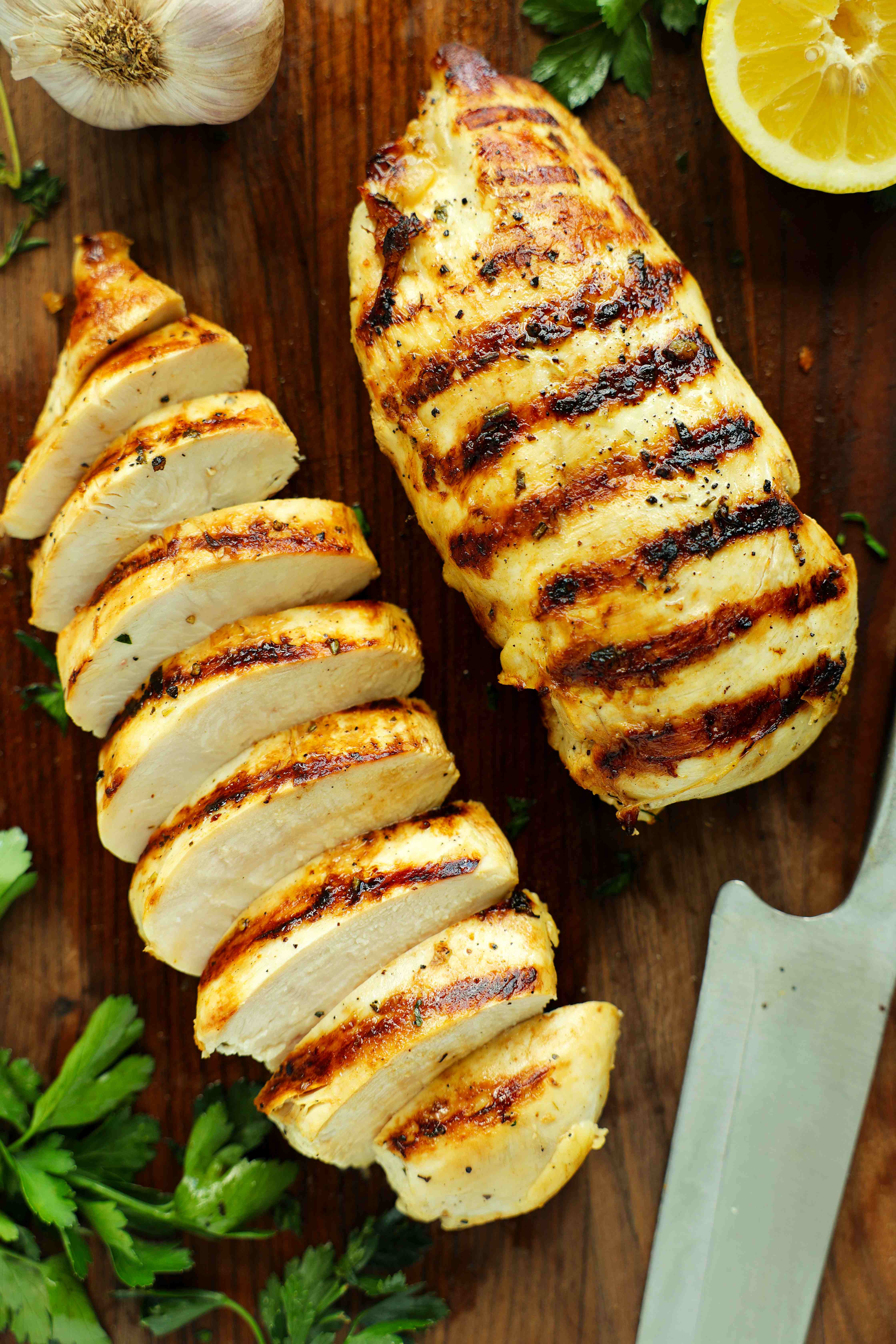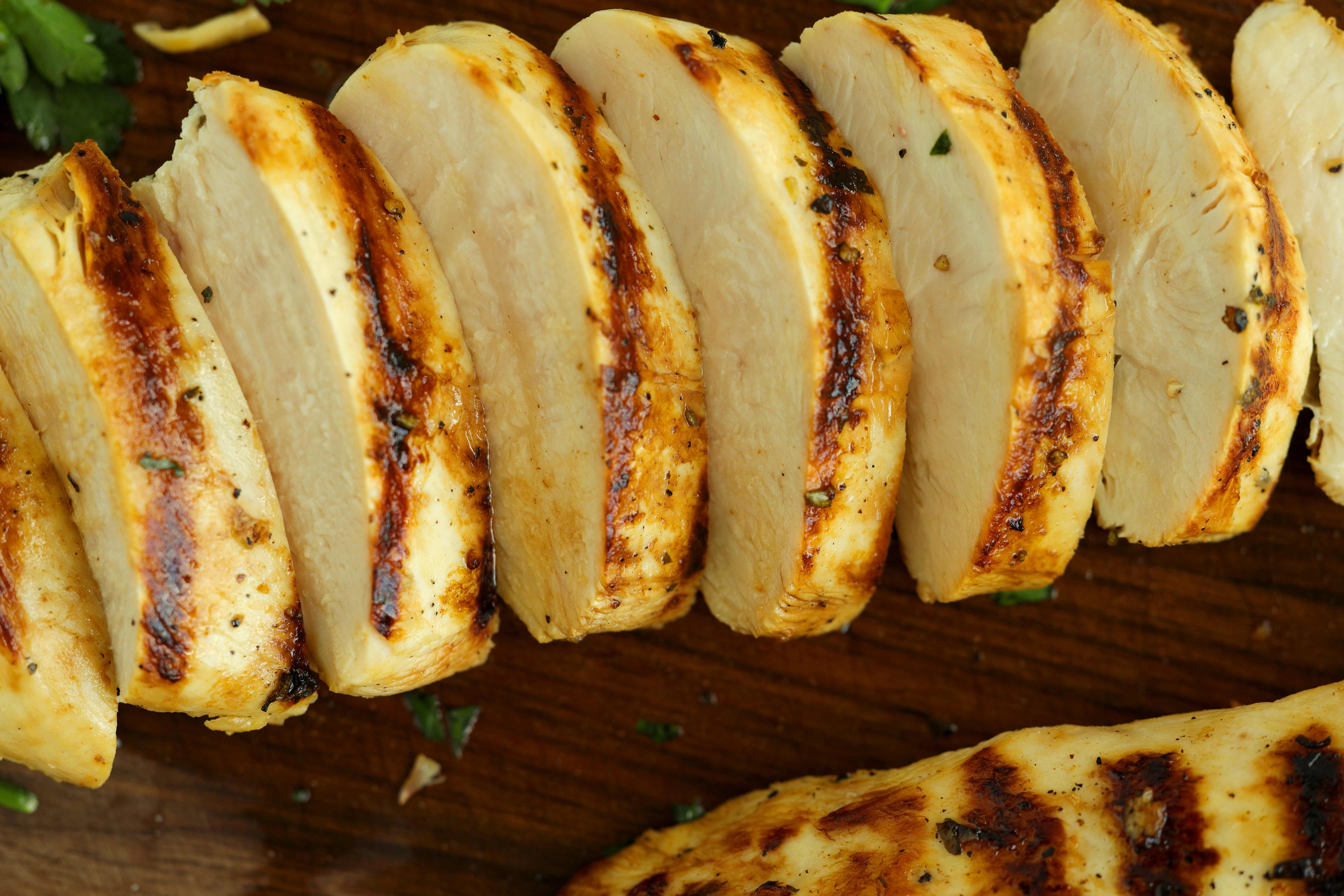 • Close-up of grilled chicken breast with charred grill marks and garlic herb marinade